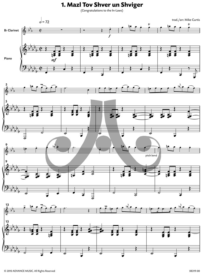 Product Code: 08319 Klezmer Diptych, a solo for clarinet with piano accompaniment, features two contrasting traditional klezmer tunes. Originally played at weddings, Mazl Tov Shver un Shviger (Congratulations to the In-laws) is a medium-tempo dance with several evocative sections. Koyln (Coal), which follows almost without pause, is quick and lively. Mike Curtis has arranged these to reflect the clarinet styles of Naftule Brandwine and Dave Tarras. |