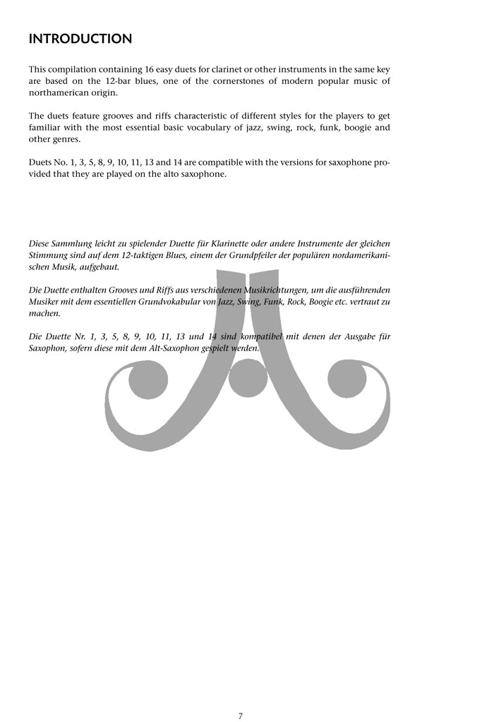 This compilation containing 16 easy duets for clarinet or other instruments in the same key are based on the 12-bar blues, one of the cornerstones of modern popular music of northamerican origin.