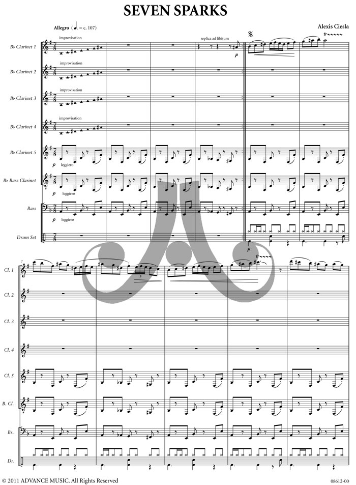 Seven Sparks is an original composition for clarinet ensemble with optional bass and drums.