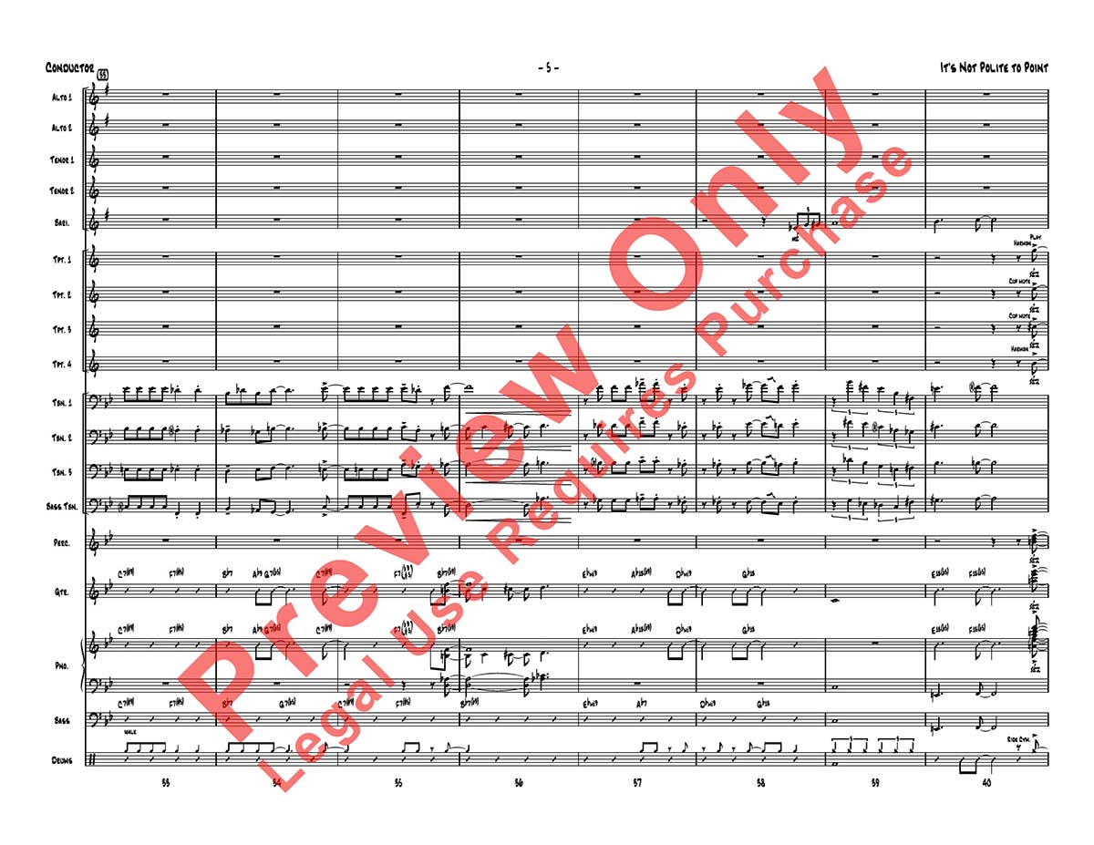 Product Code: 38709 As recorded by the Big Phat Band on the CD Thats How We Roll, this swing chart features the trombone section. Its not crazy hard to play, but will require some endurance from the bones. Solo changes provided for trombones 1 and 2, alto, tenor, bari, and trumpet 4. Lead trumpet hits a high G but otherwise its not too demanding.