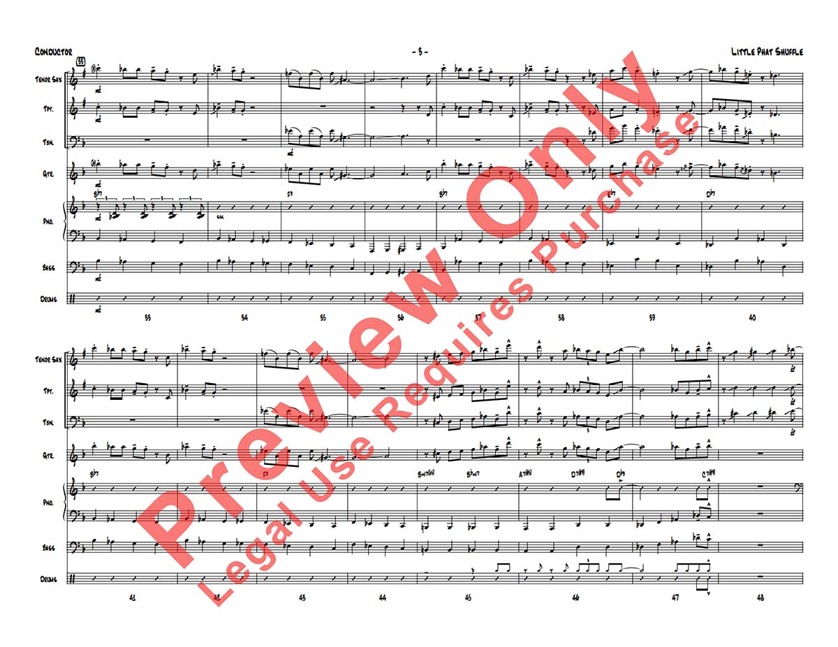Product Code: 40392 As performed by Gordon Goodwin's Little Phat Band, the instrumentation is tenor sax, trumpet, trombone, piano, guitar, bass (acoustic), and drums. As the title suggests, this one is a shuffle at around 170 BPM. A catchy melody and nicely put together with solo space for all. A fun chart. (2:45) This title is available in SmartMusic.