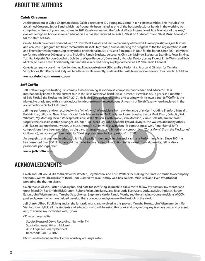 Product Code: AJM-GU Award-winning jazz educator Caleb Chapman and multi-Grammy-winning saxophonist Jeff Coffin have created a highly effective approach to jazz articulation. Step-by-step, this book details Caleb's proven approach for mastering the fundamentals of jazz articulation, phrasing, and interpretation. Inside each book are 17 units with exciting, original compositions by Jeff Coffin, carefully designed to reinforce these concepts. The included CD has both demo and play-along tracks featuring a world-class quartet of Jeff Coffin (tenor saxophone), Victor Wooten (bass), Roy "Futureman" Wooten (drums), and Chris Walters (piano). This method makes approaching jazz articulation easy and fun. Follow the explanations, do lots of listening, play along, practice what you have heard, and before long you, too, will be an articulate jazz musician!