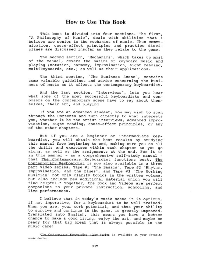 The third section, The Business Scene, contains guidelines and industry advice for contemporary keyboardists. Section four, Interviews, provides insights into the artistry and technique of famous players such as Herbie Hancock, Henry Mancini, Edgar Winter, Keith Emerson, Paul Shaffer and many more. Includes an index playing, with foreword by Chick Corea. All levels. 551 pages