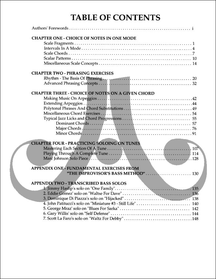 Book/CD Set by Sher & Johnson Expand your ability to create coherent and meaningful bass solos. A thorough method that takes you through step by step with complete examples by Marc Johnson on the two CD's.