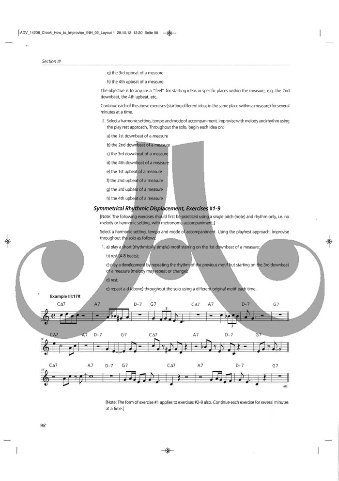 "I have reviewed, read and used practically hundreds of jazz methods and I can honestly say that NONE of them are like How to Improvise. Where other authors overly concern themselves with which scale to play on which chord or memorizing ii V I licks in every key, Crook teaches us how to play music.