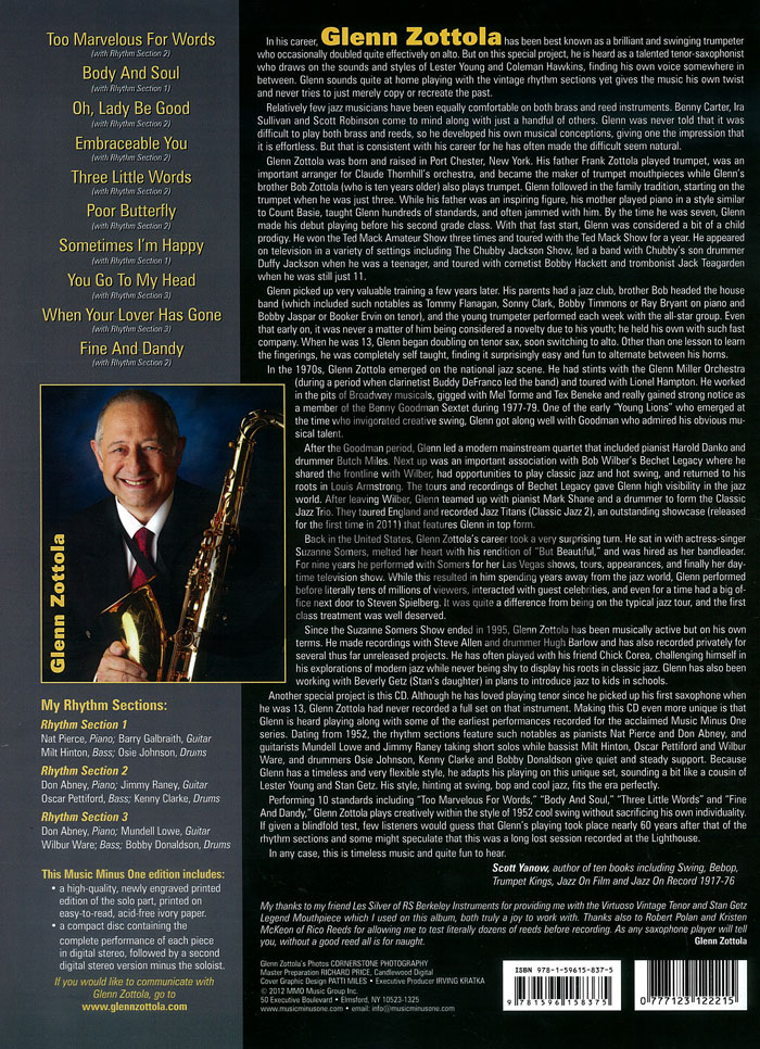 Product Code: MMOCD12221 In his career, Glenn Zottola has been best known as a brilliant and swinging trumpeter who occasionally doubles effectively on Alto Sax. But on this special project, he is heard as a talented tenor saxophonist who draws on the sounds and styles of Lester Young and Coleman Hawkins, finding his own voice somewhere in between. Glenn sounds quite at home playing with the vintage rhythm sections yet give the music his own twist and never tries to just merely copy or recreate the past.