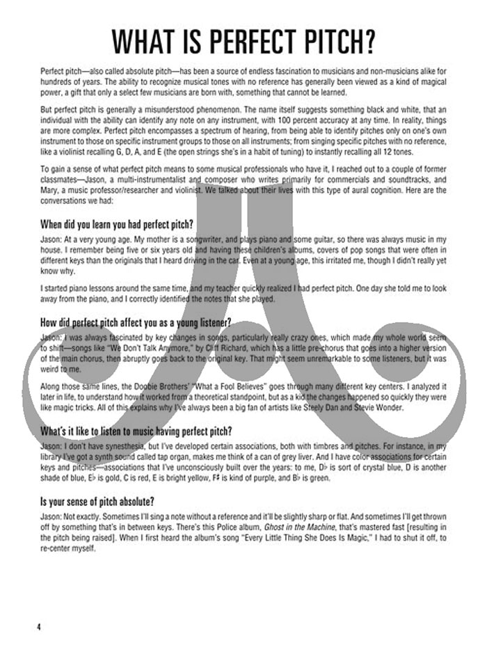 Product Code: PPM Perfect pitch – also called absolute pitch – has been a source of endless fascination for hundreds of years. The ability to recognize musical tones with no reference is often viewed as a kind of magical power, a gift that only a select few musicians are born with, a skill that cannot be learned. But perfect pitch is largely a misunderstood phenomenon. The Hal Leonard Perfect Pitch Method is designed to help you develop a sense of perfect pitch. In the process, your overall musicianship will benefit and you'll start listening to music on a deeper level and getting more satisfaction from it. At the heart of this book is a series of 49 ear-training sessions, one per day for seven weeks, using the included CDs or the online audio. Many of the lessons include three separate drills. You can do just one and save the others for later, or all three at the same time. Take your time, advancing to the next session only when you're satisfied with your results on the previous session. Pretty soon, you'll notice a marked improvement in your pitch acuity! |