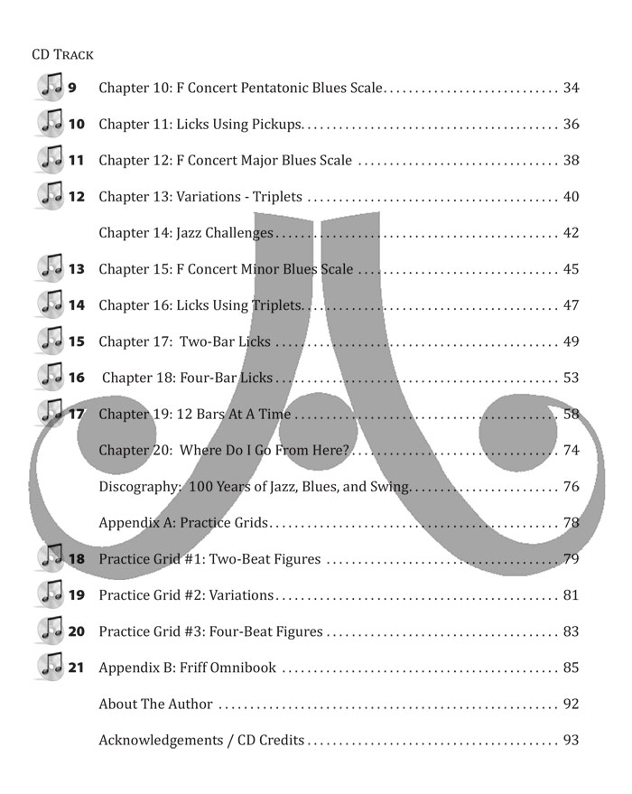 - Melodically, the book starts with playing simple rhythmic figures on any note, then on the tonic of the F blues scale, followed by the tonic and one other note. Over the course of the book, it progresses to show how and when to use three kinds of blues scales.