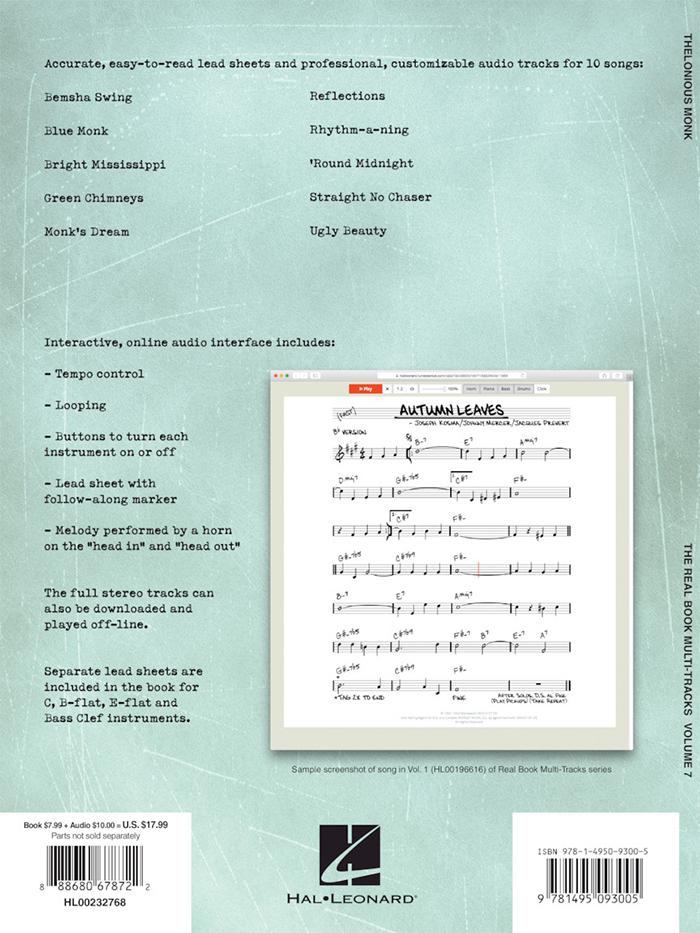 Product Code: RMT-TM Today's best way to practice jazz! Accurate, easy-to-read lead sheets and professional, customizable audio tracks accessed online for 10 songs. The interactive, online audio interface includes: tempo control; looping; buttons to turn each instrument on or off; lead sheet with follow-along marker; and melody performed by a saxophone or trumpet on the “head in” and “head out.” The full stereo tracks can also be downloaded and played off-line. Separate lead sheets are included for C, B-flat, E-flat and Bass Clef instruments.
