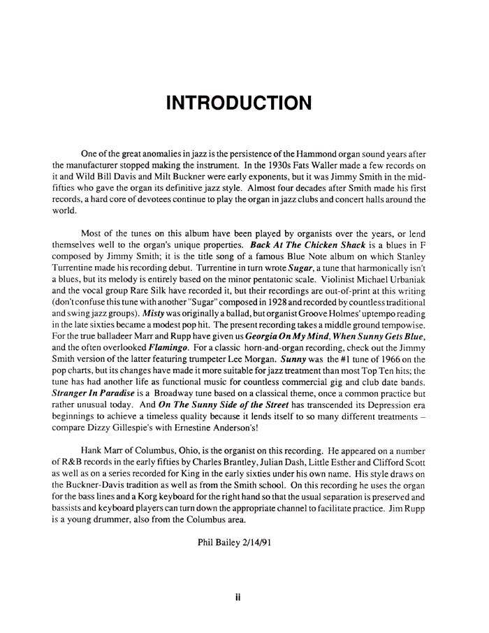 Product Code: V49DS All Levels. Nothing beats the thumpin' sound and feel of the Hammond B3 Organ. People from the great Jimmy Smith to the young and exciting Joey DeFrancesco have demonstrated its unique ability to swing hard! Now, for the first time, you can take advantage of the opportunity to play along with two of Jazz's finest. Once you try it, you'll be hooked! The song selection is perfect for the organ, as many have an inherent "bluesy" sound. You'll find playing lyrically much easier and you'll love the heavy blues flavoring. Don't miss this one! |