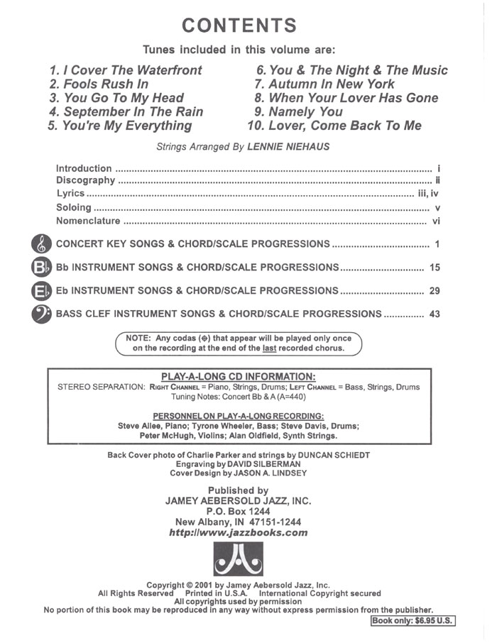 Product Code: V97BK Play-A-Long Book ONLY! Intermediate/Advanced. When Charlie Parker made his famous ""with strings"" recordings, jazz musicians realized the potential of lushly orchestrated strings to enhance their own creativity. Legendary players soon followed suit, making a ""with strings"" album almost an essential rite of passage. Here are 10 beautiful standards arranged by jazz great and award-winning arranger Lennie Niehaus. |