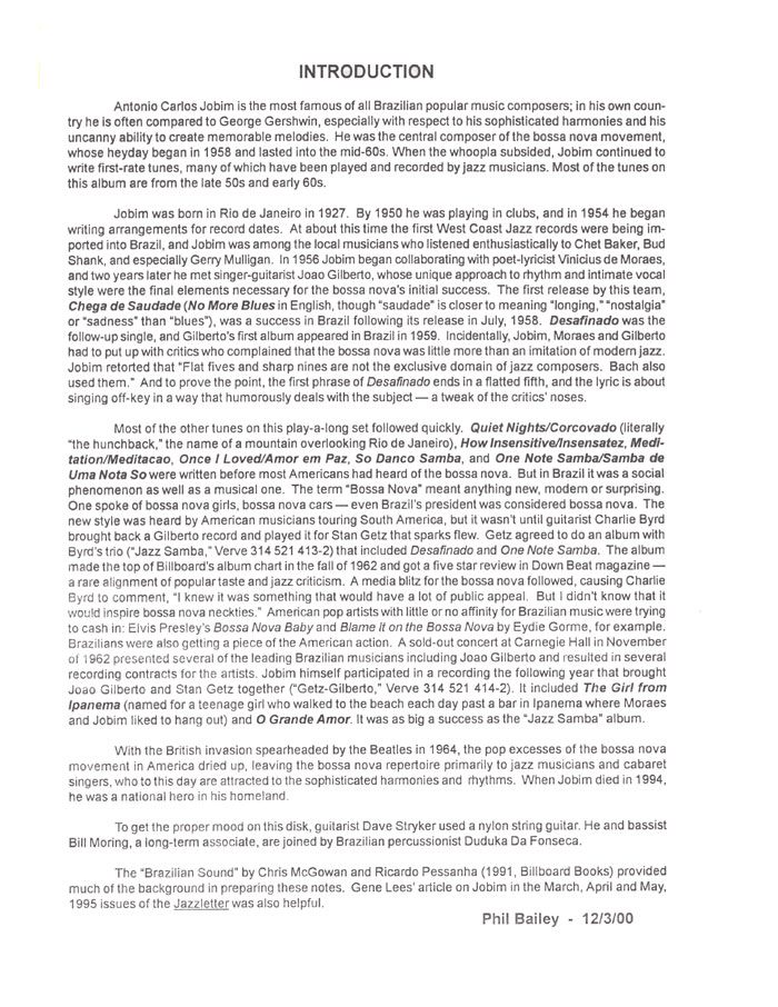 Product Code: V98BK Play-A-Long Book ONLY! Intermediate/Advanced. By popular request, here we have world-famous works from the Bossa Nova's greatest master, played with exceptional taste and sensitivity in an authentic, relaxed style with a nylon string acoustic guitar rhythm section. For bossa novas with a discreet ""jazz"" flavor, check out Volume 31 ""Bossa Novas."" Book includes lyrics. |